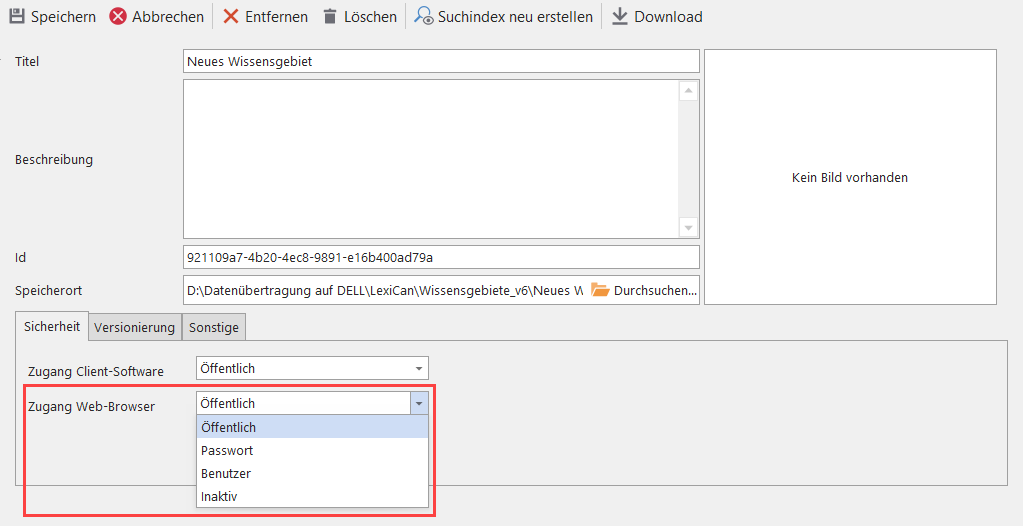 Starten Sie den lexiCan Administrator und wählen Sie in der Übersicht links das jeweilige Wissensgebiet. Klicken Sie auf "Bearbeiten". Im Bereich "Sicherheit" unter "Zugang Web-Browser" können Sie dann, festlegen ob und welchen Bedingungen der Zugriff erfolgen soll, z.B.