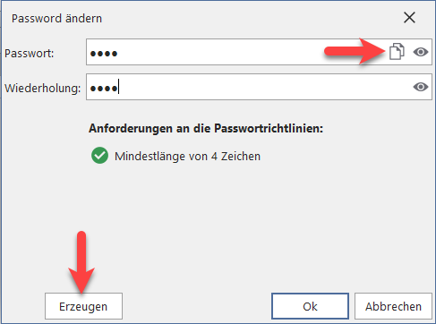 Sofern Sie die Windows-Authentifizierung nicht aktiviert haben, werden Sie dann zur Definition eines den Vorgaben genügendes Passwort aufgefordert. Sie können dieses selbst definieren oder vom System generieren lassen (Button "Erzeugen") und in den Zwischenspeicher kopieren