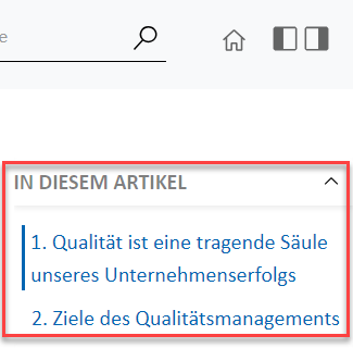 Das automatische Inhaltsverzeichnis, das die Unterteilung eines Artikels mittels Überschriften zur Grundlage hat (siehe Hilfe für Anwender ) ist Teil des Kontextbereichs am rechten Bildschirmrand.